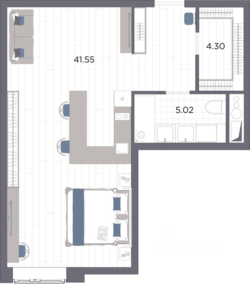 В проекте 960 апартаментов повышенной комфортности площадью от 24,2 до 60, 8 кв.м. Средняя площадь апартамента 28,2 кв.м. Все апартаменты сдаются с отделкой "под ключ" в единой стилистике.