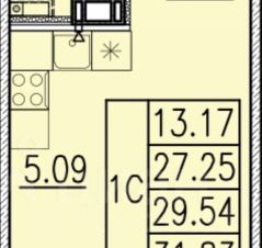 Параметры на фото планировки чуть отличаются, коридор и лоджия по итогу больше чем на начальной планировке, в документах указано это, коридор и лоджия по 4.8 вместо 4.42 и 4.58. Жилая площадь 13.17 м2 + 5.09 кухня и 4.8 м2 коридор, лоджия 4.8 м2, с/у 4.57 м2