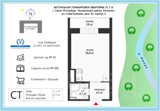 Общая площадь квартиры - 21,7 кв.м. + балкон 3,8 кв.м.,