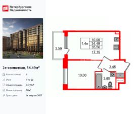 Удобная, классическая, функциональная европланировка, большая кухня-гостиная 17.19 м², вместительная прихожая 3.45 м². Общая площадь квартиры - 34.49 м², жилая 10 м², высота потолка 2.75 м.