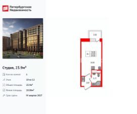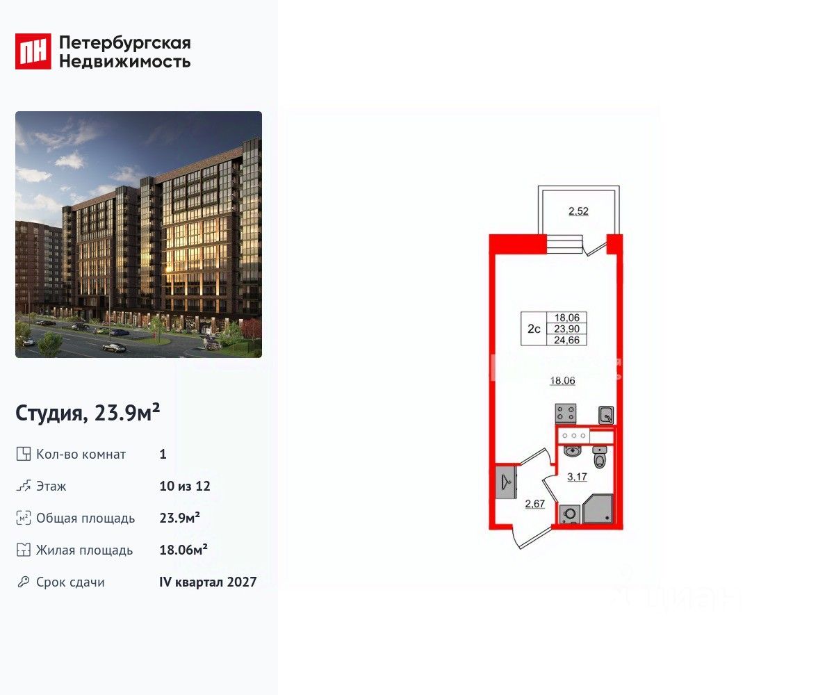 Удобная, классическая, функциональная европланировка, вместительная прихожая 2.67 м². Общая площадь студии - 23.9 м², жилая 18.06 м², высота потолка 2.75 м.