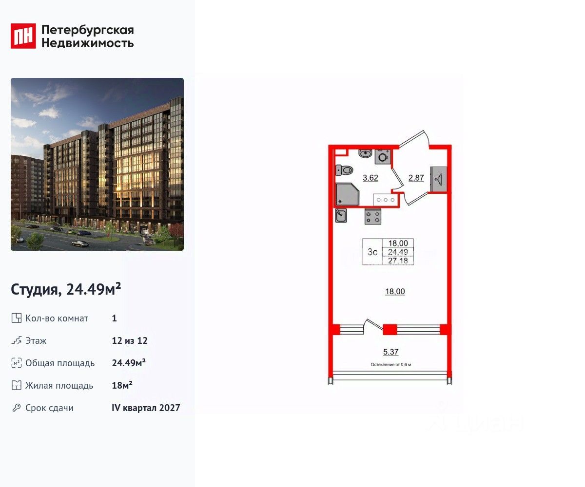 Удобная, классическая, функциональная европланировка, вместительная прихожая 2.87 м². Общая площадь студии - 24.49 м², жилая 18 м², высота потолка 3 м.