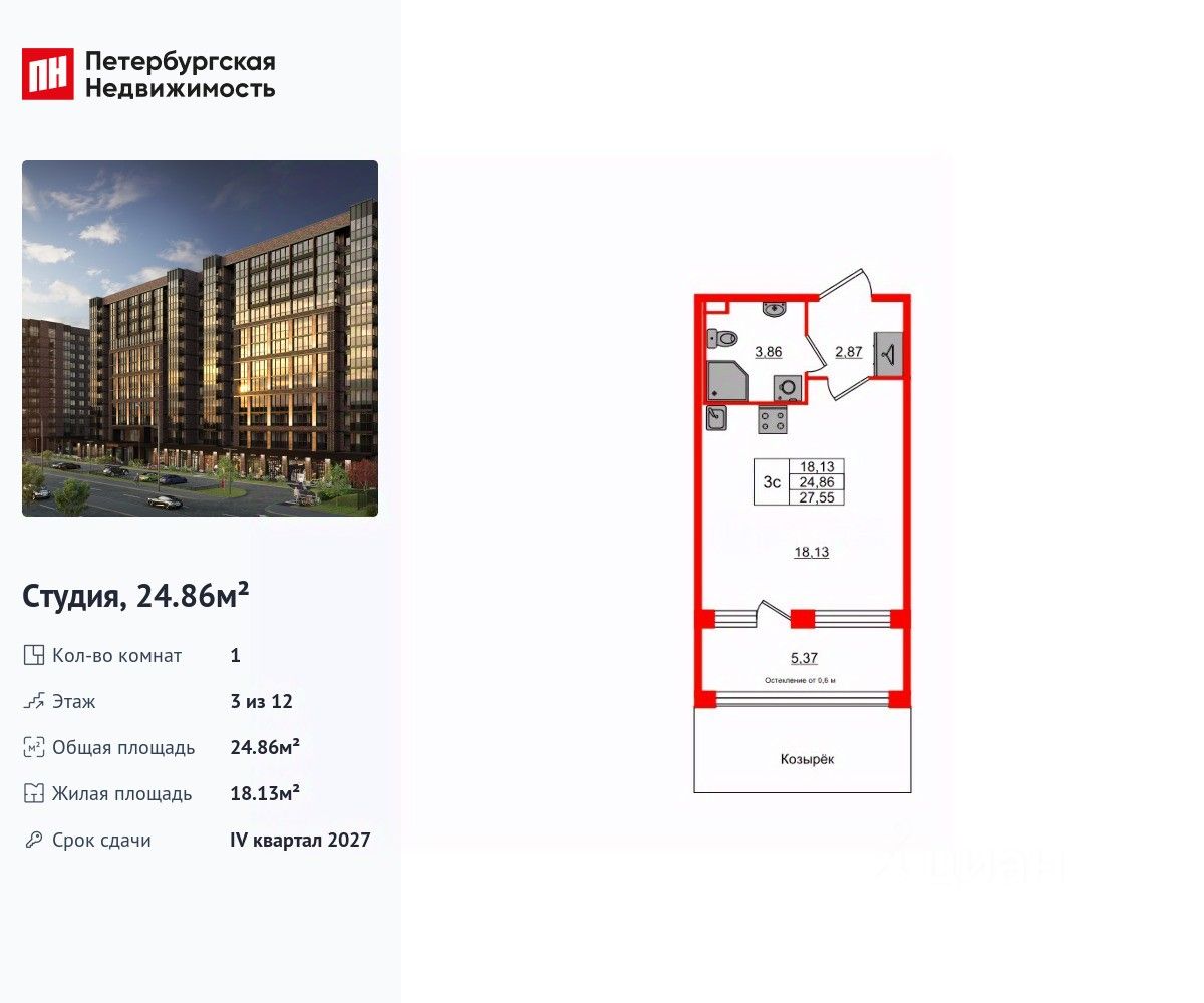 Удобная, классическая, функциональная европланировка, вместительная прихожая 2.87 м². Общая площадь студии - 24.86 м², жилая 18.13 м², высота потолка 2.75 м.