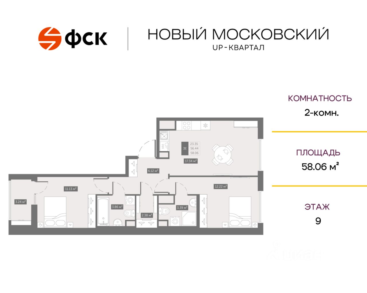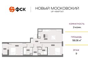 Цена со скидкой до 30% в прямой продаже от застройщика — только в этом месяце. Беспроцентная рассрочка. 2-к квартира в ЖК Up-квартал "Новый Московский" на 9-м этаже. Общая площадь 58,06. Чистовая отделка.