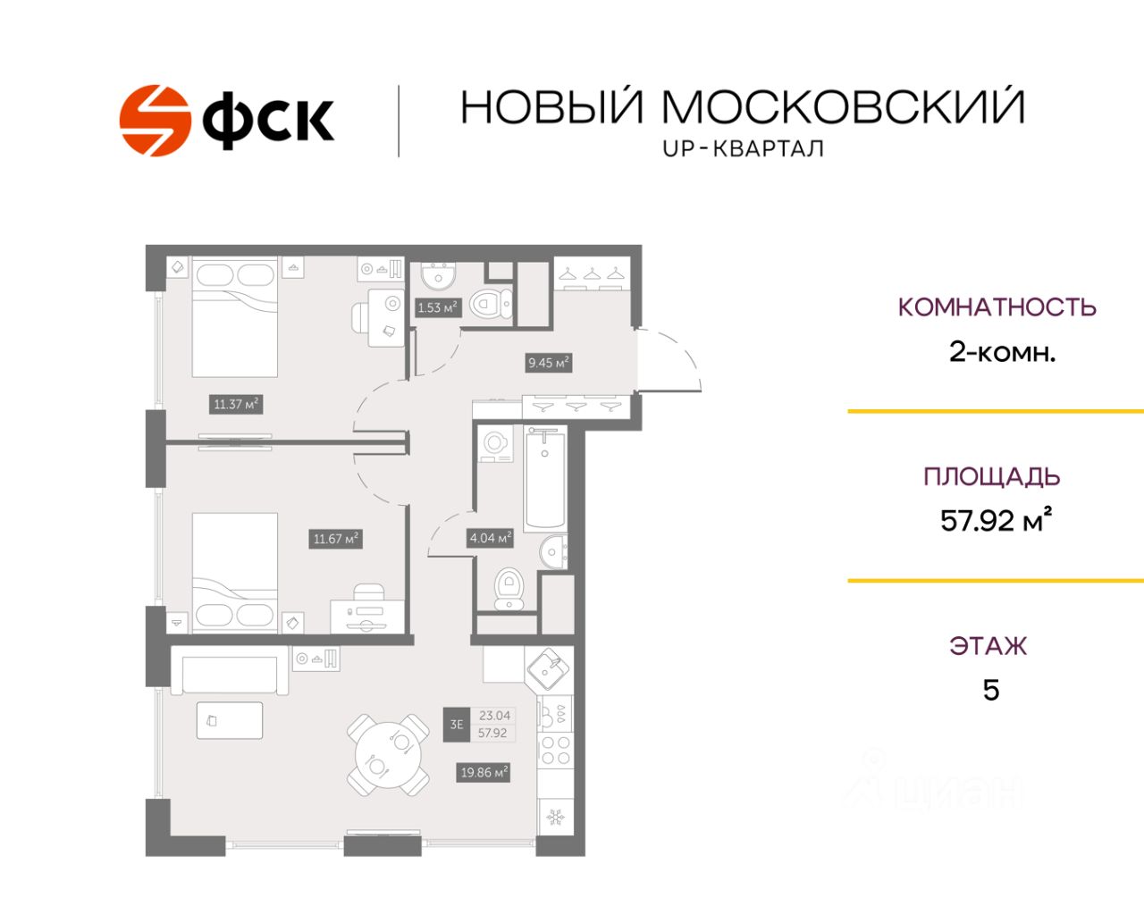 Цена со скидкой до 30% в прямой продаже от застройщика — только в этом месяце. Беспроцентная рассрочка. 2-к квартира в ЖК Up-квартал "Новый Московский" на 5-м этаже. Общая площадь 57,92. Без отделки.