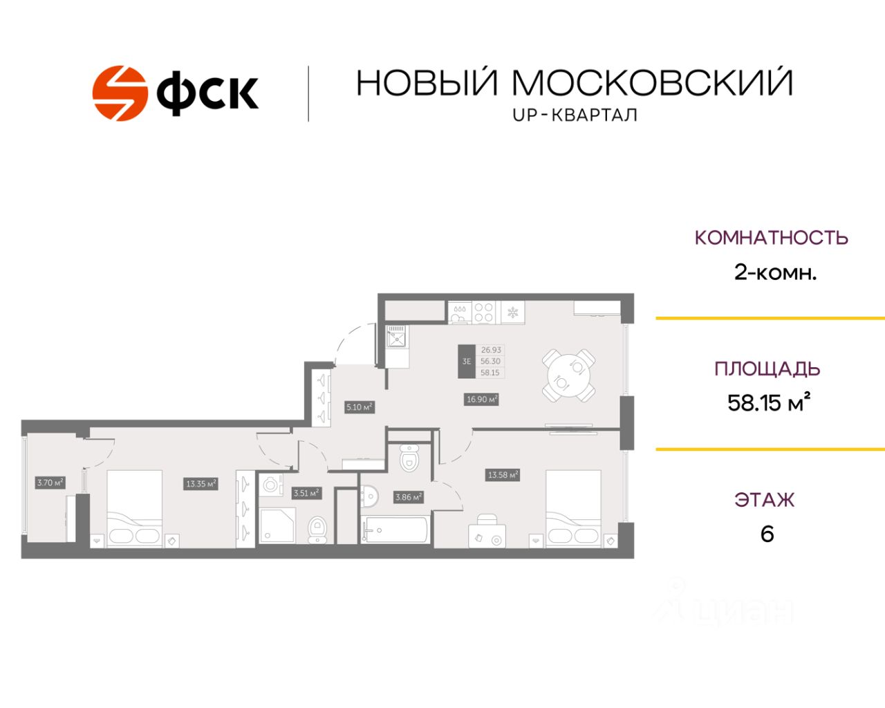 Цена со скидкой до 30% в прямой продаже от застройщика — только в этом месяце. Беспроцентная рассрочка. 2-к квартира в ЖК Up-квартал "Новый Московский" на 6-м этаже. Общая площадь 58,15. Без отделки.