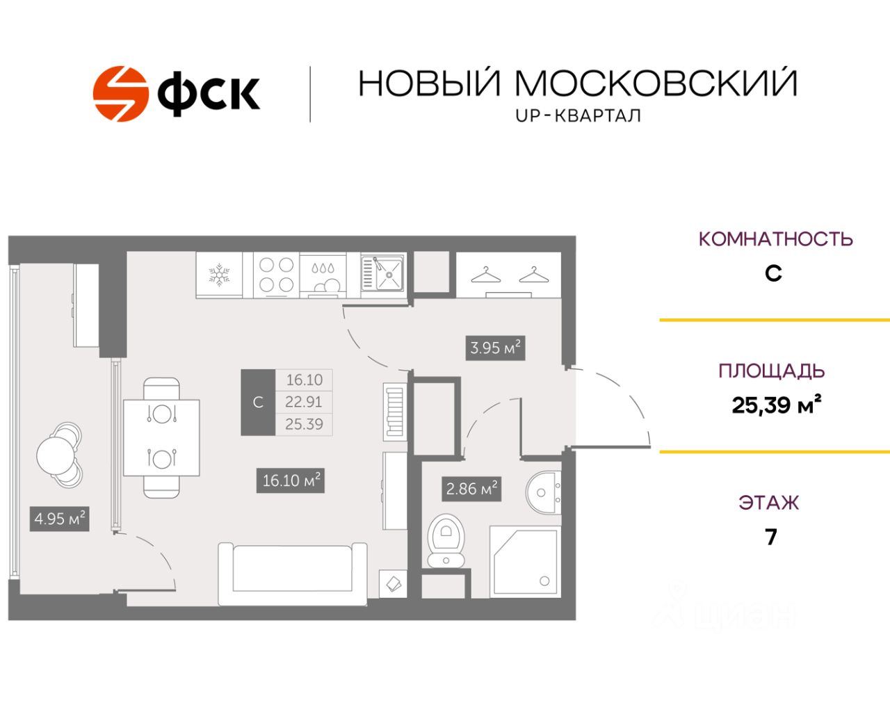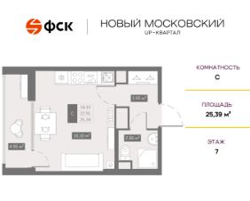 Цена со скидкой до 30% в прямой продаже от застройщика — только в этом месяце. Беспроцентная рассрочка. Студия в ЖК Up-квартал "Новый Московский" на 7-м этаже. Общая площадь 25,39. Без отделки.