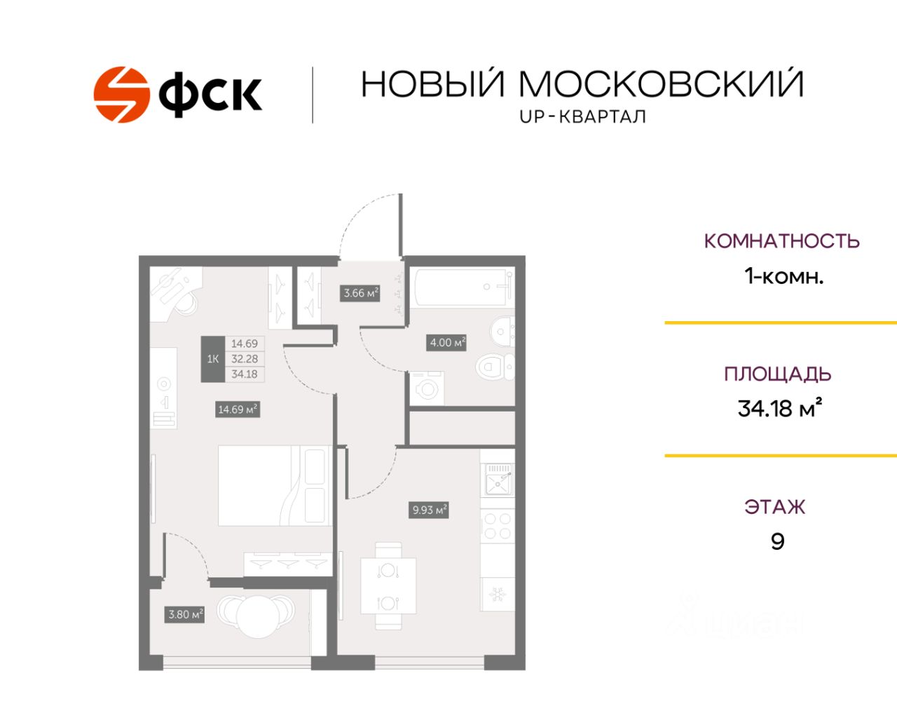 Цена со скидкой до 30% в прямой продаже от застройщика — только в этом месяце. Беспроцентная рассрочка. 1-к квартира в ЖК Up-квартал "Новый Московский" на 9-м этаже. Общая площадь 34,18. Без отделки.