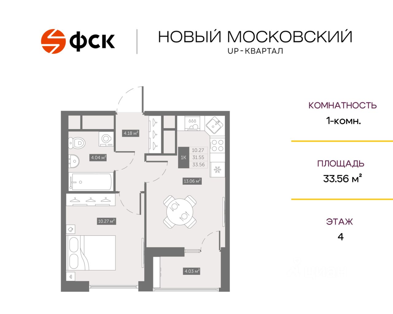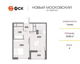 Цена со скидкой до 30% в прямой продаже от застройщика — только в этом месяце. Беспроцентная рассрочка. 1-к квартира в ЖК Up-квартал "Новый Московский" на 4-м этаже. Общая площадь 33,56. Без отделки.