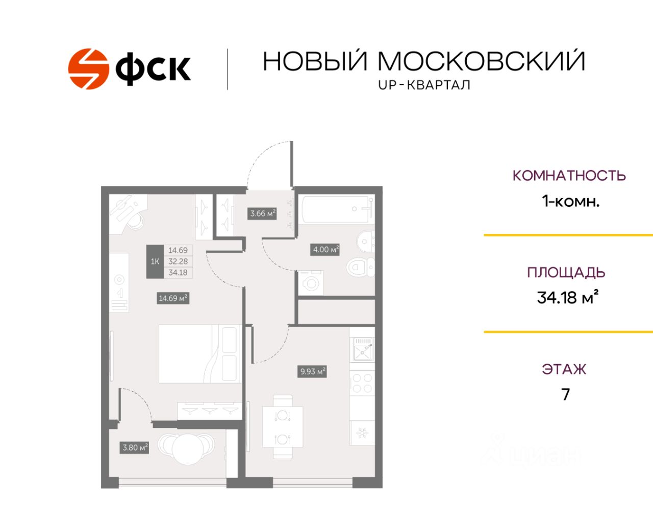 Цена со скидкой до 30% в прямой продаже от застройщика — только в этом месяце. Беспроцентная рассрочка. 1-к квартира в ЖК Up-квартал "Новый Московский" на 7-м этаже. Общая площадь 34,18. Без отделки.