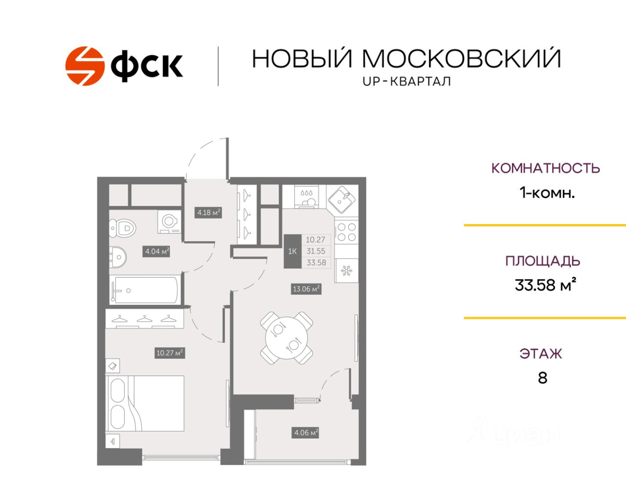 Цена со скидкой до 30% в прямой продаже от застройщика — только в этом месяце. Беспроцентная рассрочка. 1-к квартира в ЖК Up-квартал "Новый Московский" на 8-м этаже. Общая площадь 33,58. Без отделки.