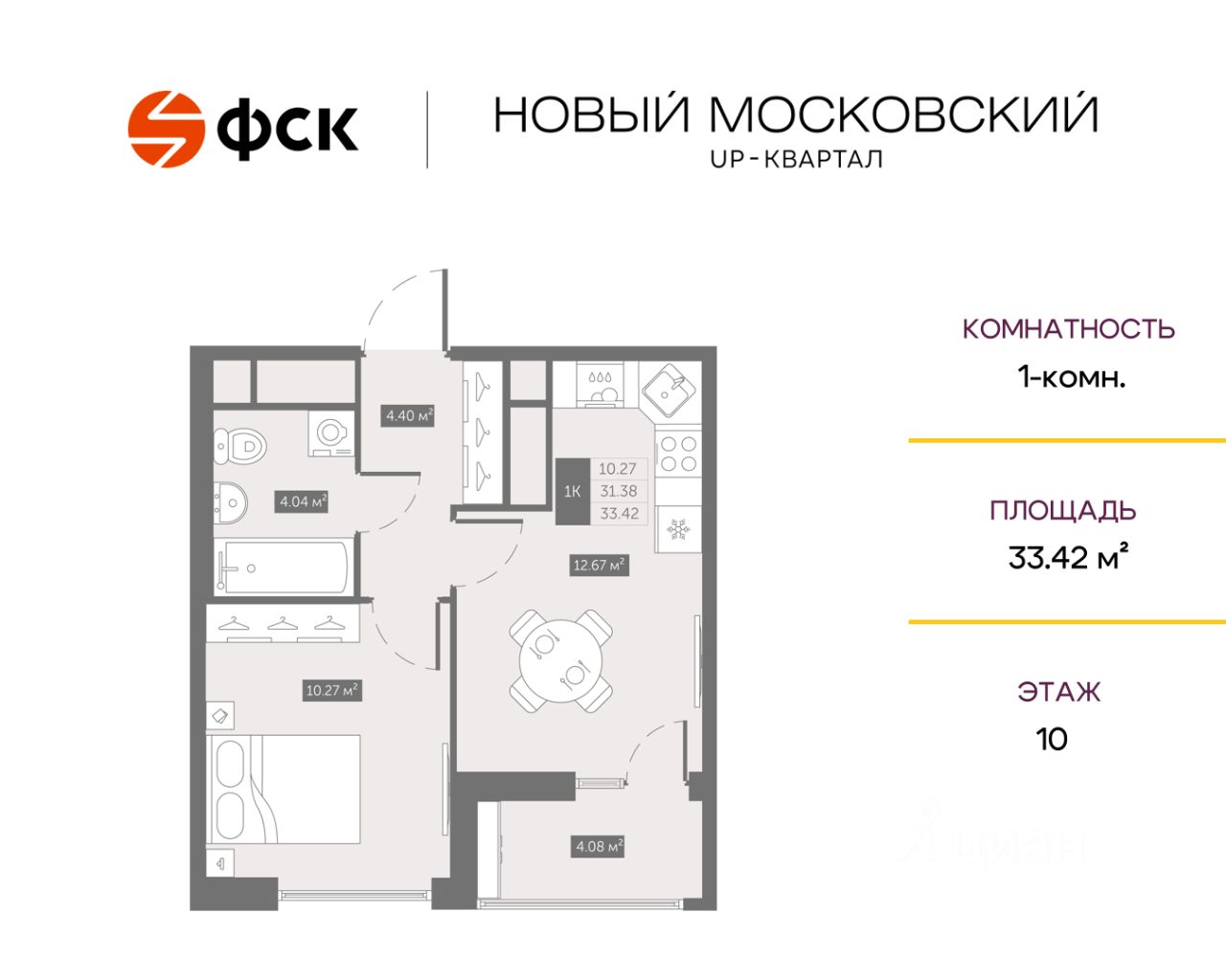 Цена со скидкой до 30% в прямой продаже от застройщика — только в этом месяце. Беспроцентная рассрочка. 1-к квартира в ЖК Up-квартал "Новый Московский" на 10-м этаже. Общая площадь 33,42. Без отделки.