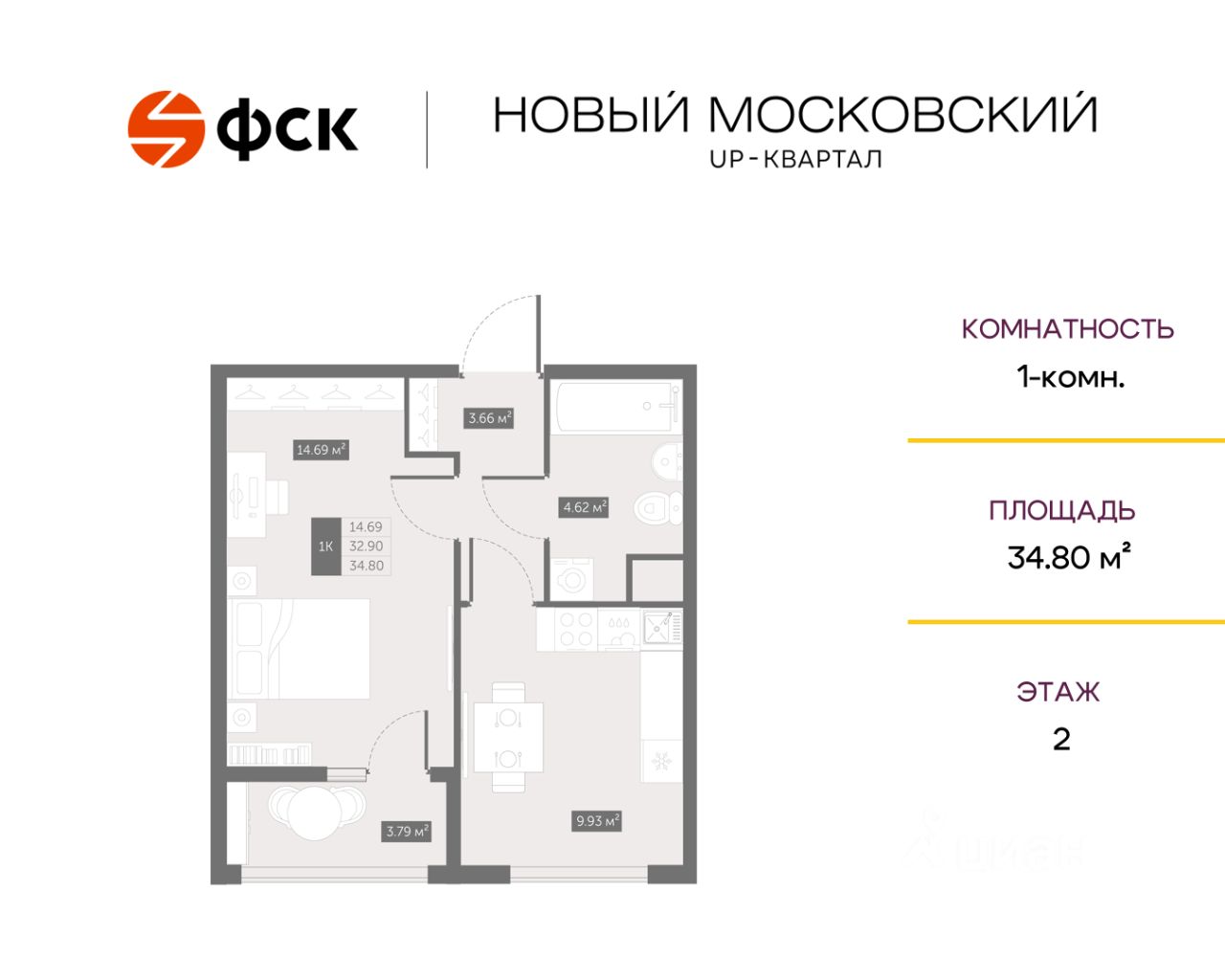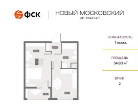 Цена со скидкой до 30% в прямой продаже от застройщика — только в этом месяце. Беспроцентная рассрочка. 1-к квартира в ЖК Up-квартал "Новый Московский" на 2-м этаже. Общая площадь 34,8. Без отделки.