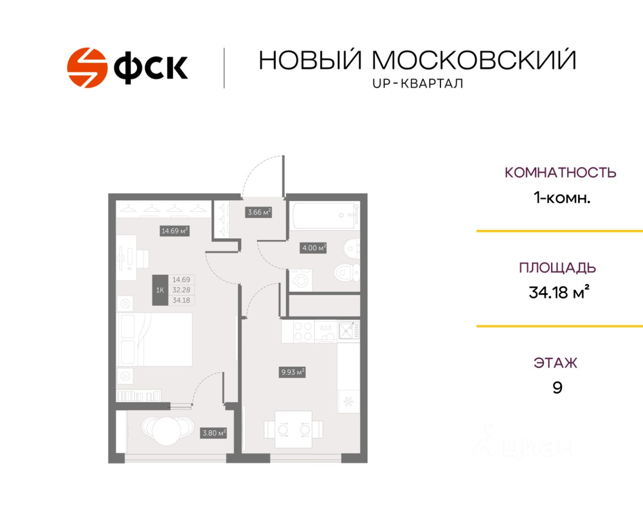 Цена со скидкой до 30% в прямой продаже от застройщика — только в этом месяце. Беспроцентная рассрочка. 1-к квартира в ЖК Up-квартал "Новый Московский" на 9-м этаже. Общая площадь 34,18. Без отделки.