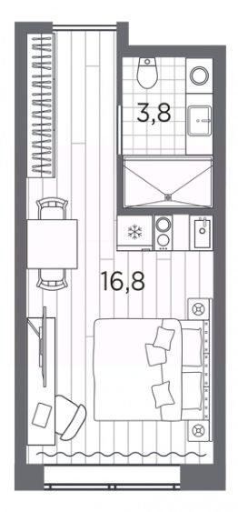 Просторные 1-комн. апартаменты-студия с отделкой в ЖК "Industrial AVENIR" на 10 этаже. Общая площадь: 20.6 кв.м., площадь гостиной 16.8 кв.м., из которых 5 кв.м. выделено под кухонную зону. Все окна выходят на одну сторону. В апартаментах один совмещенный санузел. Высота потолков 2.5 м.