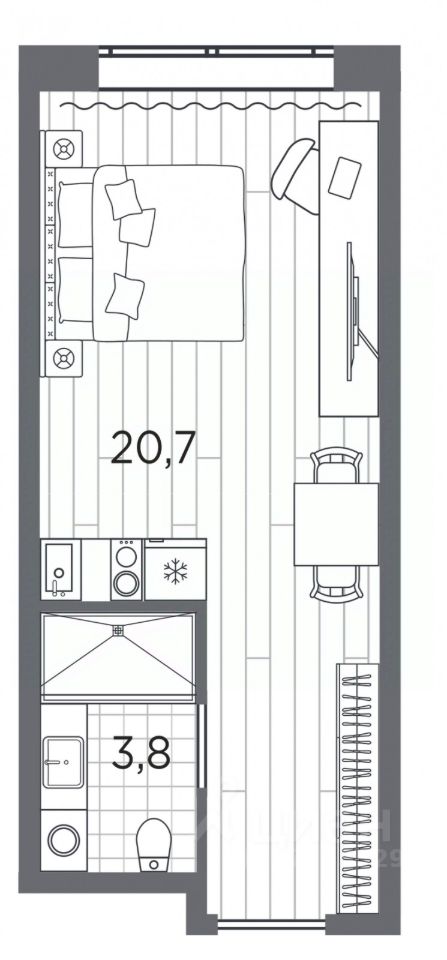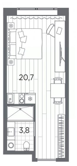 Продаются 1-комн. апартаменты-студия от застройщика с отделкой в ЖК "Industrial AVENIR" на 10 этаже. Общая площадь: 24.5 кв.м., площадь гостиной 20.7 кв.м., из которых 5 кв.м. выделено под кухонную зону. Все окна выходят на одну сторону. В апартаментах один совмещенный санузел. Высота потолков 2.5 м.