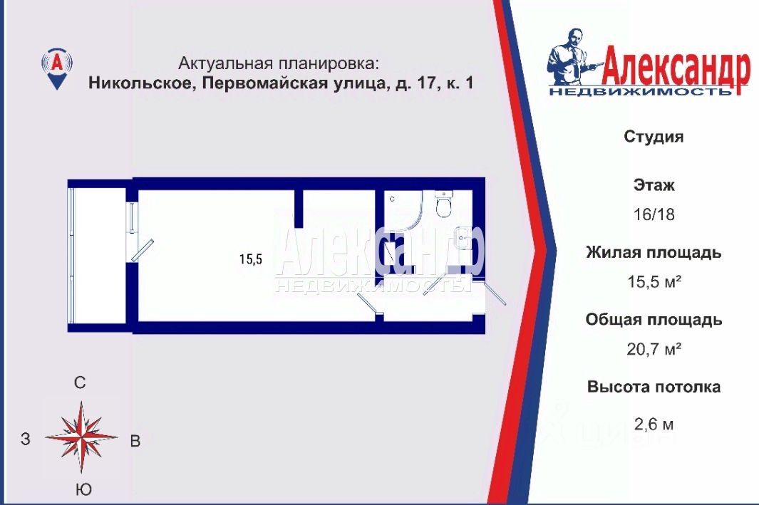 1703308 Прoдaм квартиру-студию с лоджией в г. Никoльcкoе, Тосненского р-на.