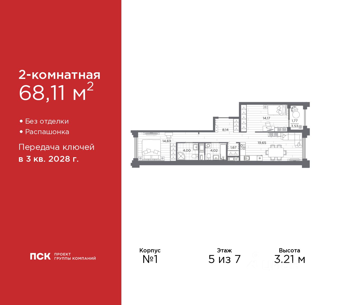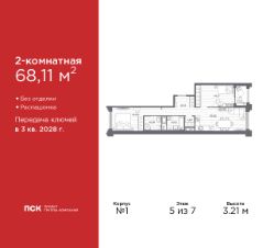Продается двухкомнатная квартира в Клубный квартал "Ассамблея" на 5 этаже. Квартира без отделки, новый владелец может сделать ремонт по своему дизайн-проекту. Общая площадь: 68.11 кв.м., жилая: 28.86 кв.м., площадь просторной кухни-столовой: 19.65 кв.м. Квартира - распашонка, без проходных комнат, окна выходят на paзные стороны дома. В квартире одна лоджия, два совмещенных санузла. Высота потолков 3.21 м.