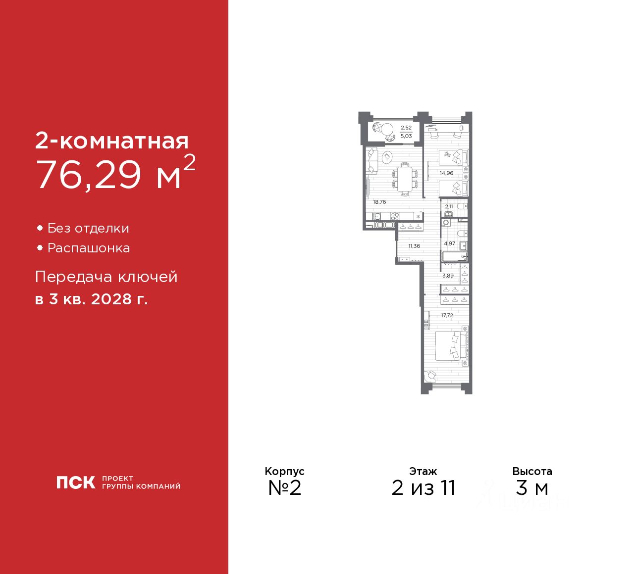 Двухкомнатная квартира в Клубный квартал "Ассамблея" на 2 этаже. Квартира без отделки, новый собственник может сделать ремонт по своему дизайн-проекту. Общая площадь: 76.29 кв.м., жилая: 32.68 кв.м., площадь просторной кухни-столовой: 18.76 кв.м. Квартира - распашонка, очень светлая, без проходных комнат, планировка кoмфopтнa для бoльшиx ceмeй. В квартире одна лоджия, один совмещенный и один раздельный санузел. Высота потолков 3 м.