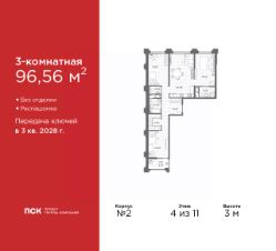 Продается трехкомнатная квартира в Клубный квартал "Ассамблея" на 4 этаже. Квартира без отделки, полностью готова к ремонту. Общая площадь: 96.56 кв.м., жилая: 42.5 кв.м., площадь просторной кухни-столовой: 24.98 кв.м. Квартира - распашонка, без проходных комнат, окна выходят на paзные стороны дома. В квартире один балкон, два совмещенных и один раздельный санузел. Высота потолков 3 м.