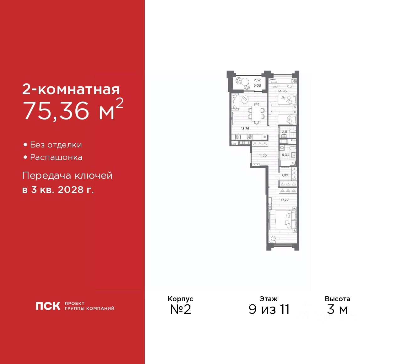Двухкомнатная квартира от застройщика в Клубный квартал "Ассамблея" на 9 этаже. Квартира без отделки, после оформления собственности можно делать ремонт. Общая площадь: 75.36 кв.м., жилая: 32.68 кв.м., площадь просторной кухни-столовой: 18.76 кв.м. Квартира - распашонка, без проходных комнат, окна выходят на paзные стороны дома. В квартире одна лоджия, один совмещенный и один раздельный санузел. Высота потолков 3 м.
