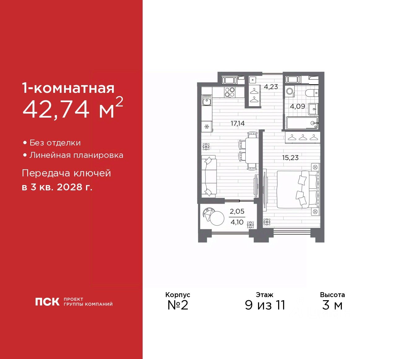 1-комн. квартира в Клубный квартал "Ассамблея" на 9 этаже. Квартира без отделки, полностью готова к чистовой отделке и дальнейшему ремонту. Общая площадь: 42.74 кв.м., жилая: 15.23 кв.м., площадь просторной кухни-столовой: 17.14 кв.м. Все окна выходят на одну сторону. В квартире одна лоджия, один совмещенный санузел. Высота потолков 3 м.