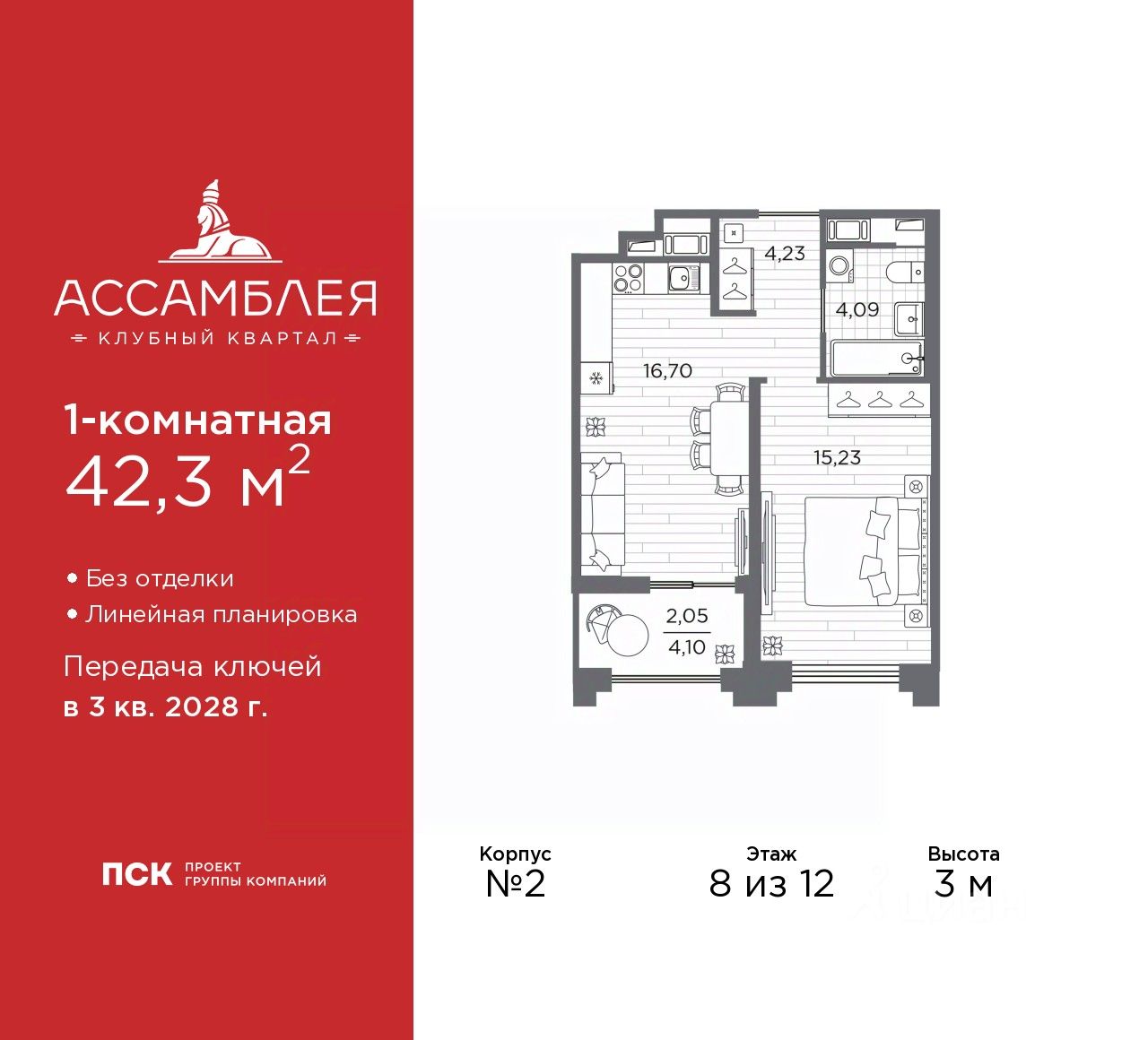 Просторная однокомнатная квартира в Клубный квартал "Ассамблея" на 8 этаже. Квартира без отделки, новый собственник может сделать ремонт по индивидуальному проекту. Общая площадь: 42.3 кв.м., жилая: 15.23 кв.м., площадь просторной кухни-столовой: 16.7 кв.м. Все окна выходят на одну сторону. В квартире одна лоджия, один совмещенный санузел. Высота потолков 3 м.