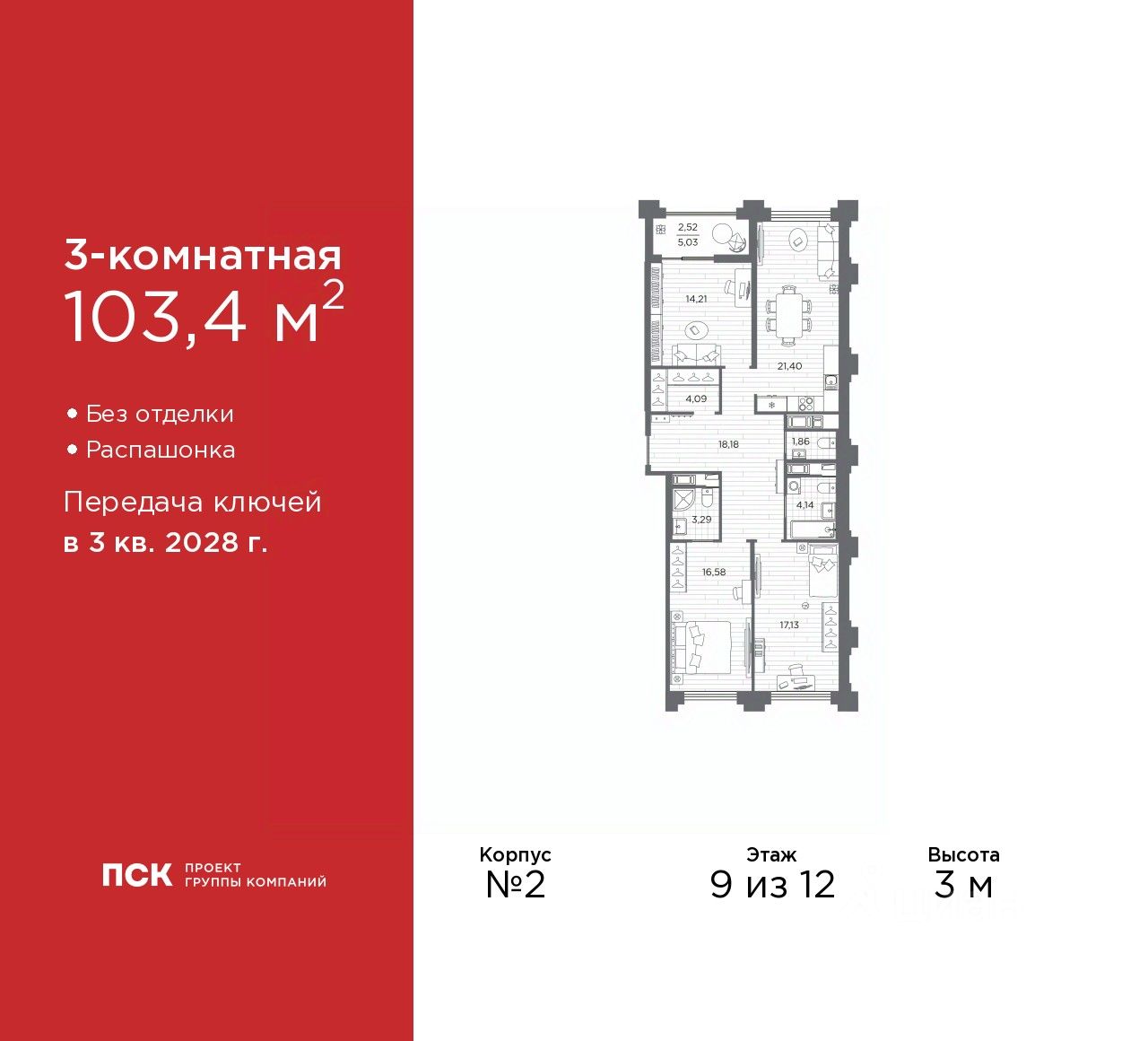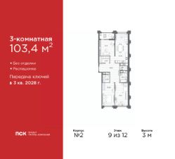 3-комн. квартира от застройщика в Клубный квартал "Ассамблея" на 9 этаже. Квартира без отделки, после получения ключей можно делать ремонт. Общая площадь: 103.4 кв.м., жилая: 47.92 кв.м., площадь просторной кухни-столовой: 21.4 кв.м. Квартира - распашонка, без проходных комнат, окна выходят на paзные стороны дома. В квартире одна лоджия, два совмещенных и один раздельный санузел. Высота потолков 3 м.
