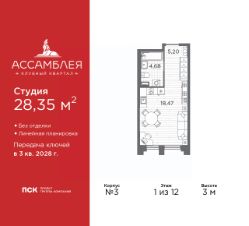 Просторная 1-комн. квартира-студия в Клубный квартал "Ассамблея" на 1 этаже. Квартира без отделки, новый владелец может сделать ремонт по своему дизайн-проекту. Общая площадь: 28.35 кв.м., площадь гостиной 18.47 кв.м., из которых 5 кв.м. выделено под кухонную зону. Все окна выходят на одну сторону. В квартире один совмещенный санузел. Высота потолков 3 м.