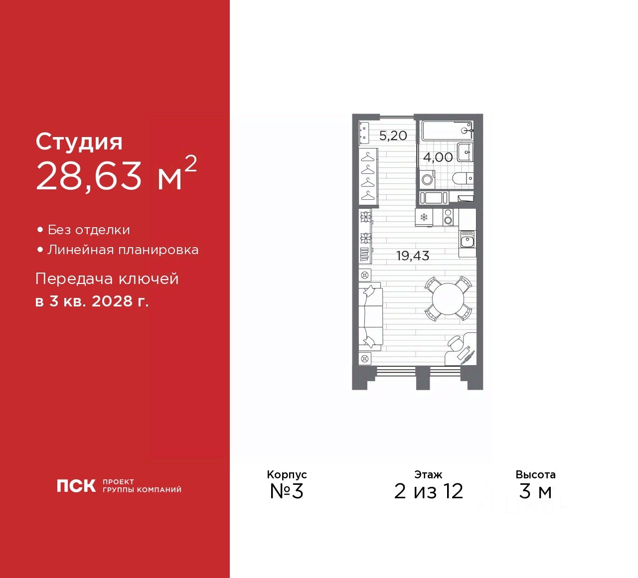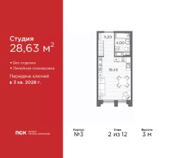 Продается однокомнатная квартира-студия от застройщика в Клубный квартал "Ассамблея" на 2 этаже. Квартира без отделки, после оформления собственности можно делать ремонт. Общая площадь: 28.63 кв.м., площадь гостиной 19.43 кв.м., из которых 5 кв.м. выделено под кухонную зону. Все окна выходят на одну сторону. В квартире один совмещенный санузел. Высота потолков 3 м.