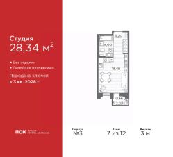 1-комн. квартира-студия от застройщика в Клубный квартал "Ассамблея" на 7 этаже. Квартира без отделки, полностью готова к ремонту. Общая площадь: 28.34 кв.м., площадь гостиной 18.48 кв.м., из которых 5 кв.м. выделено под кухонную зону. Все окна выходят на одну сторону. В квартире один балкон, один совмещенный санузел. Высота потолков 3 м.