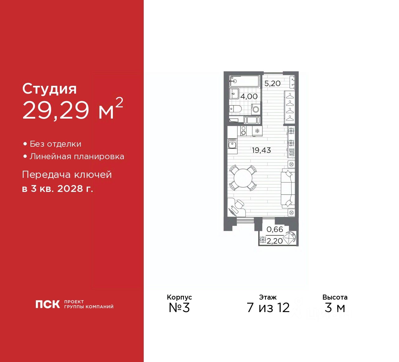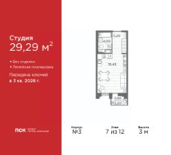 Продается однокомнатная квартира-студия от застройщика в Клубный квартал "Ассамблея" на 7 этаже. Квартира без отделки, новый собственник может сделать ремонт по своему проекту. Общая площадь: 29.29 кв.м., площадь гостиной 19.43 кв.м., из которых 5 кв.м. выделено под кухонную зону. Все окна выходят на одну сторону. В квартире один балкон, один совмещенный санузел. Высота потолков 3 м.
