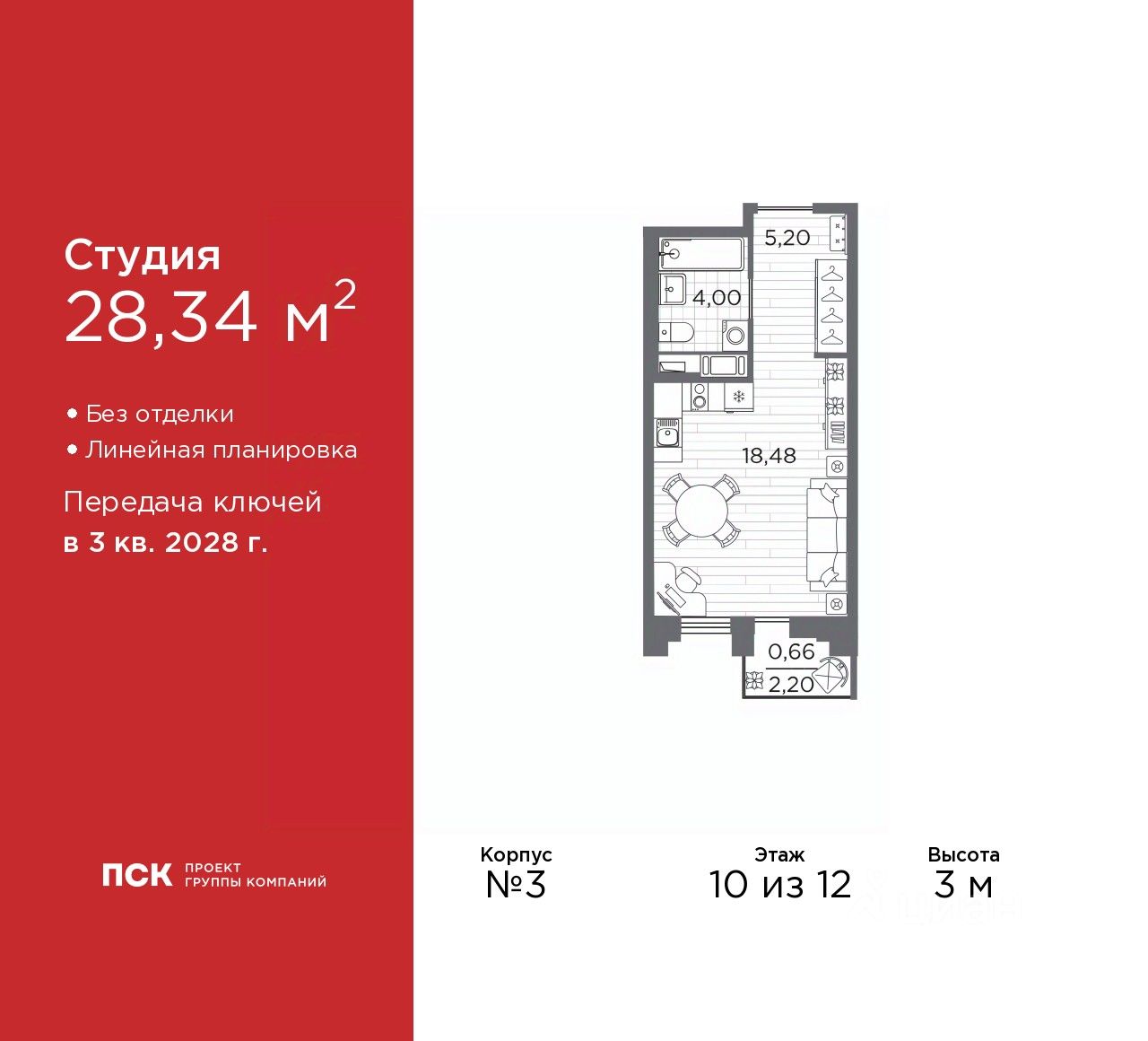 Однокомнатная квартира-студия в Клубный квартал "Ассамблея" на 10 этаже. Квартира без отделки, новый собственник может сделать ремонт по своему проекту. Общая площадь: 28.34 кв.м., площадь гостиной 18.48 кв.м., из которых 5 кв.м. выделено под кухонную зону. Все окна выходят на одну сторону. В квартире один балкон, один совмещенный санузел. Высота потолков 3 м.