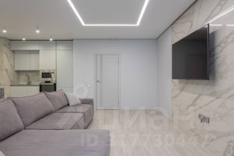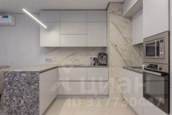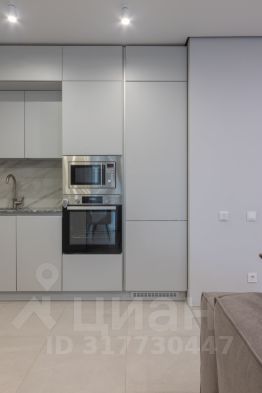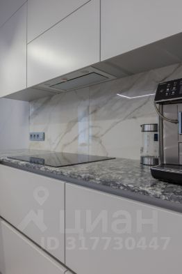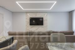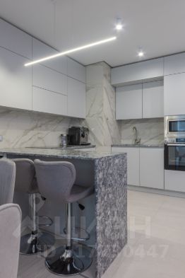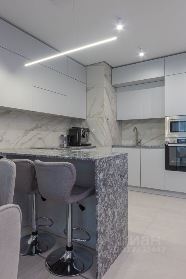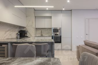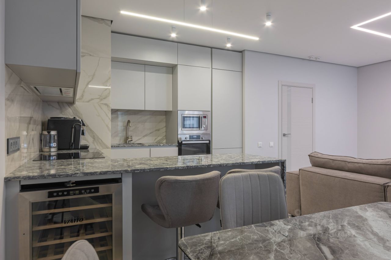 Гостиная-кухня 36м2 имеет визуальное зонирование , в зоне кухни - теплый пол, мебель со встроенной техникой, все продумано для удобства хозяйки: рабочая поверхность - качественная столешница из кварцевого агломерата, устойчивая к царапинам, к высоким температурам, а также - барная стойка с удобными мягкими барными стульями, винный шкаф, встроенная техника: