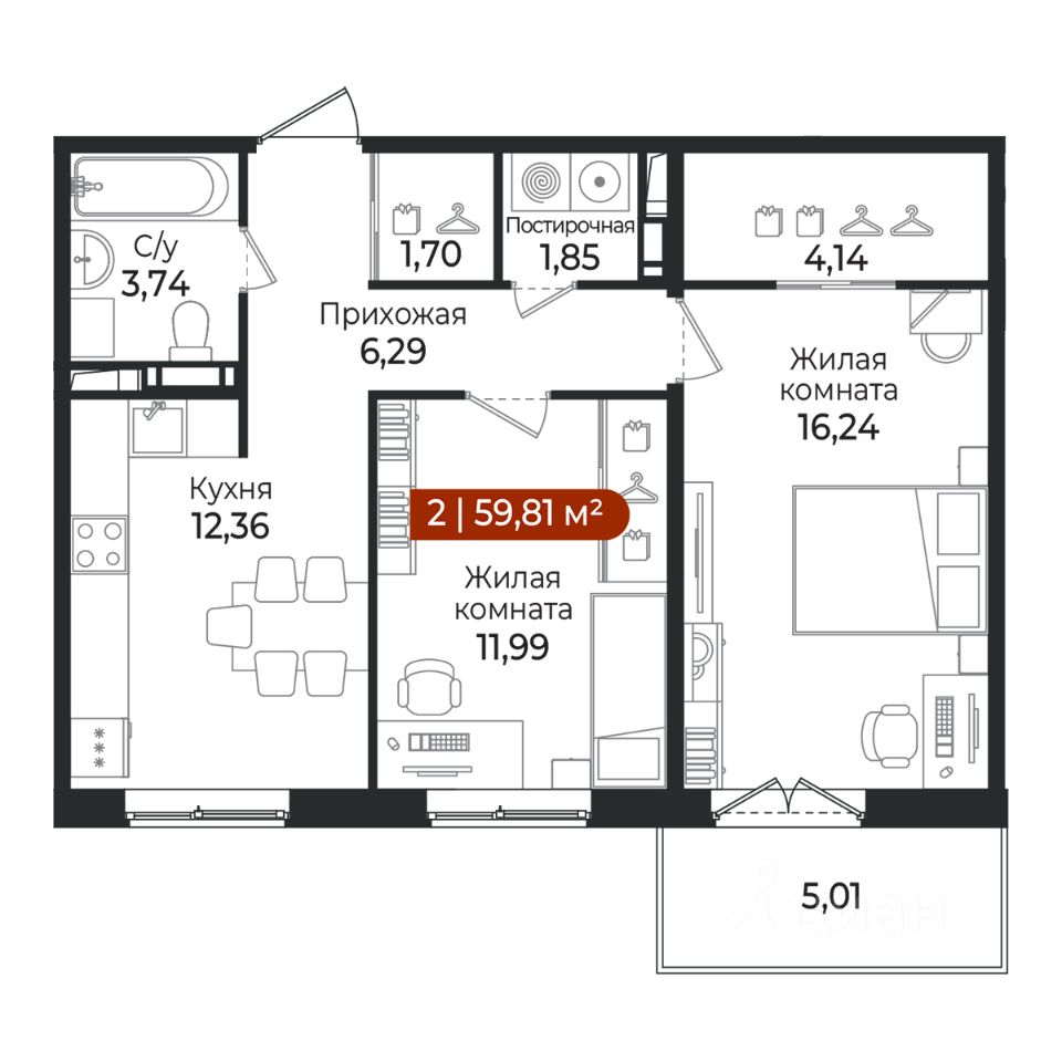 2 - комнатная квартира на 3 этаже общей площадью 59,81 м² в жилом комплексе Арт Парк от застройщика ГК Алгоритм.