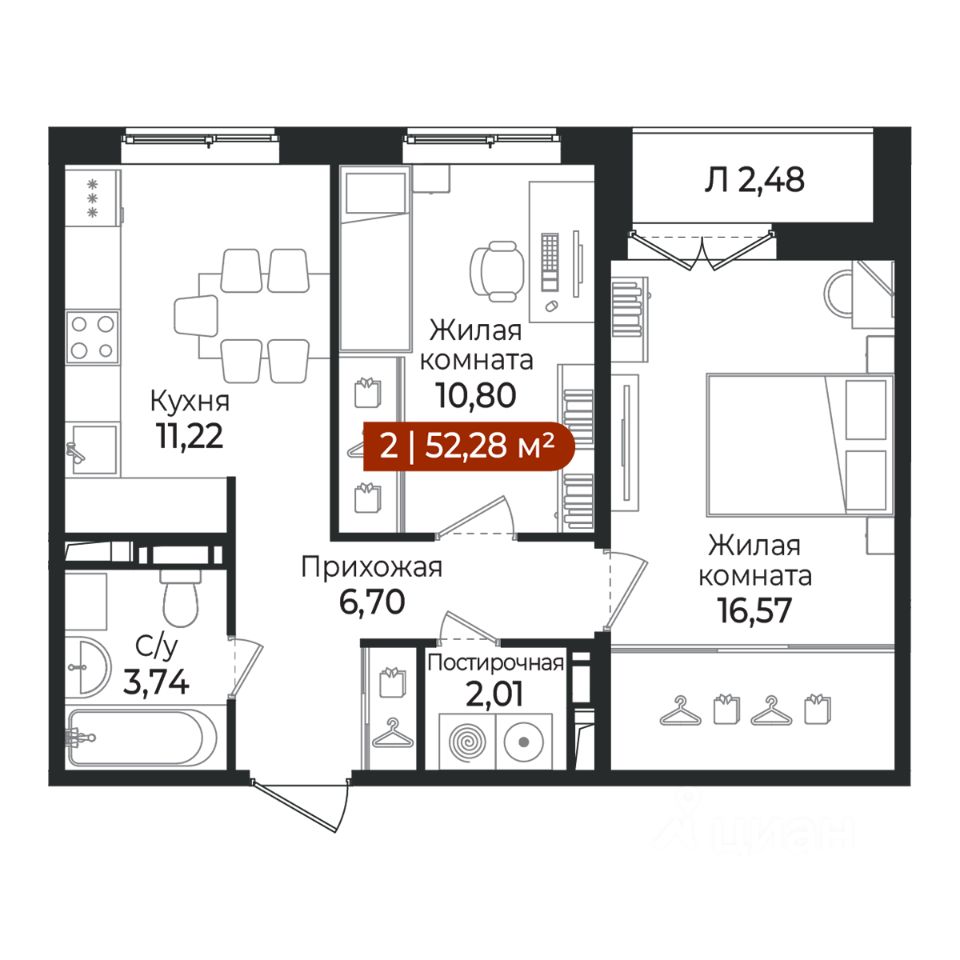 2 - комнатная квартира на 4 этаже общей площадью 52,28 м² в жилом комплексе Арт Парк от застройщика ГК Алгоритм.