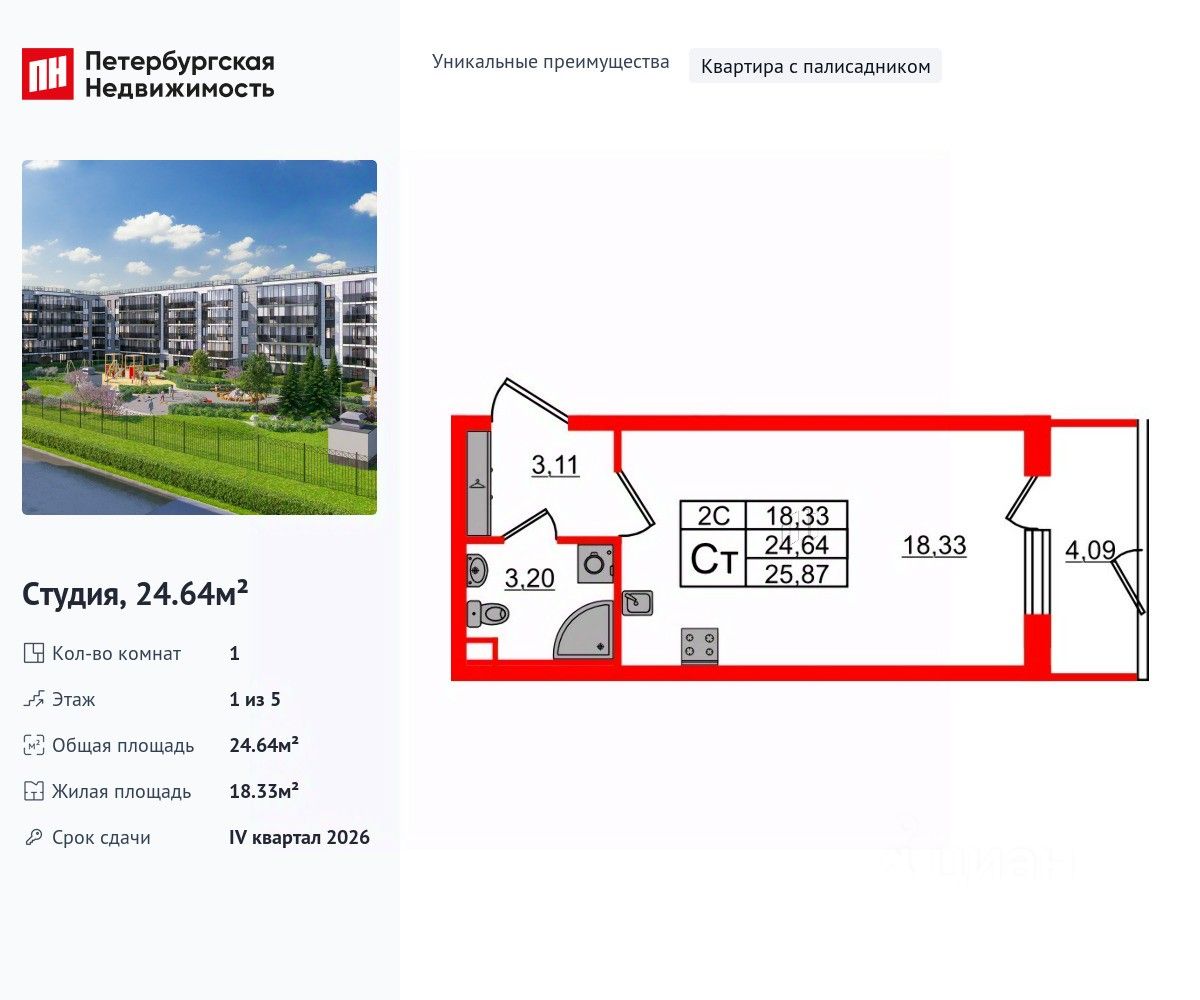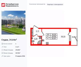 Продается просторная студия от застройщика в жилом комплексе "Парадный ансамбль" в престижном Московском районе. До метро можно добраться на транспорте всего за 20 минут. Уникальная, функциональная европланировка, вместительная прихожая 3.11 м². Общая площадь студии - 24.64 м², жилая 18.33 м², высота потолка 2.77 м. Квартира продается с отделкой "NORD LINE WHITE". Что особенного в ЖК "Парадный ансамбль"? • Инновационный Лицей Setl с оригинальной архитектурной концепцией и уникальной образовательной средой • Масштабное малоэтажное строительство в престижном Московском районе • Рекреационные зоны: парадный парк в центре квартала, ручей с собственной набережной, центральная площадь, ресторанный комплекс и пешеходный бульвар • Фасады из керамогранита и кирпича с яркими и акцентными входными группами • Две самые большие площадки Setl Kids и Setl Sport • Уникальные квартиры.High Flat на последних этажах, палисадники у квартир на первом этаже, семейные секции, квартиры с саунами и окном в ванной