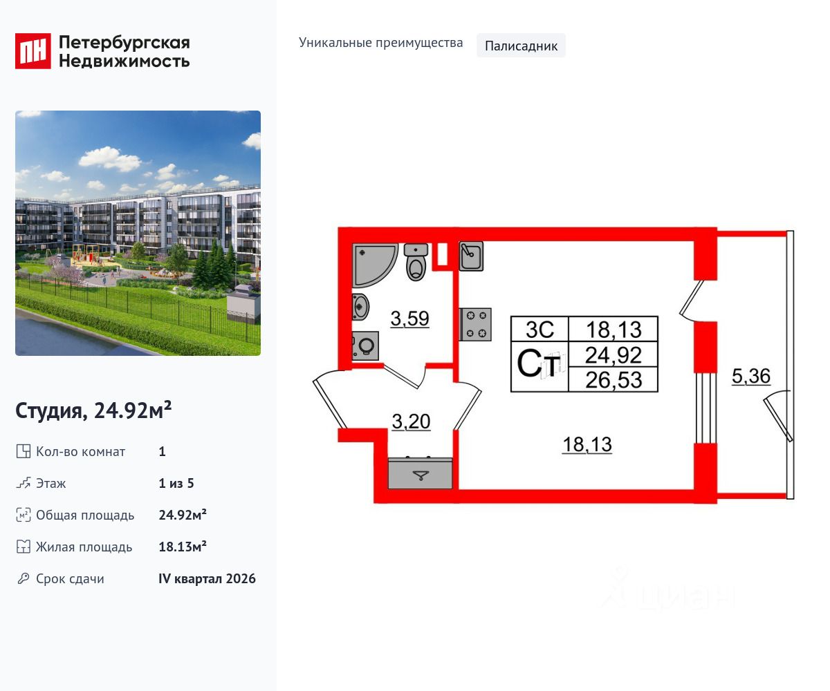 Продается просторная студия от застройщика в жилом комплексе "Парадный ансамбль" в престижном Московском районе.