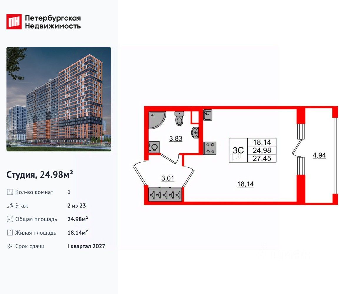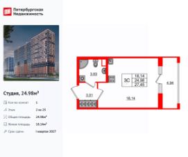 Удобная, классическая, функциональная европланировка, вместительная прихожая 3.01 м². Общая площадь студии - 24.98 м², жилая 18.14 м², высота потолка 2.75 м.