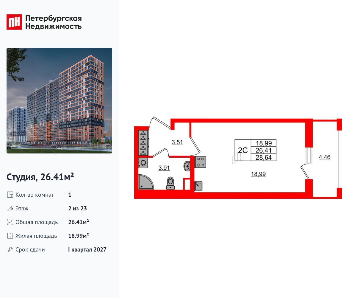 Удобная, классическая, функциональная европланировка, просторная прихожая 3.51 м². Общая площадь студии - 26.41 м², жилая 18.99 м², высота потолка 2.75 м.