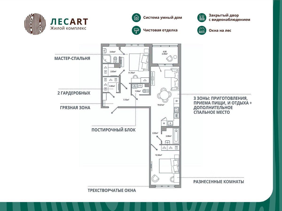 Продаётся 2-комнатная квартира 056, общей площадью 68.97 кв.м., на 12. Дом комфорт-класса, 12 этажей, в окружении леса и малоэтажной застройки. Проект с умным домом. Передача квартир в апреле 2026г.