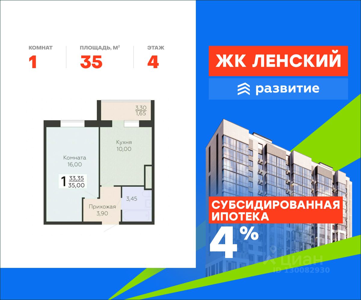 В продаже квартира площадью 35.00 кв. м с отделкой white box на 4 этаже 16 этажного дома. Квартира находится в 4834 корпусе.
