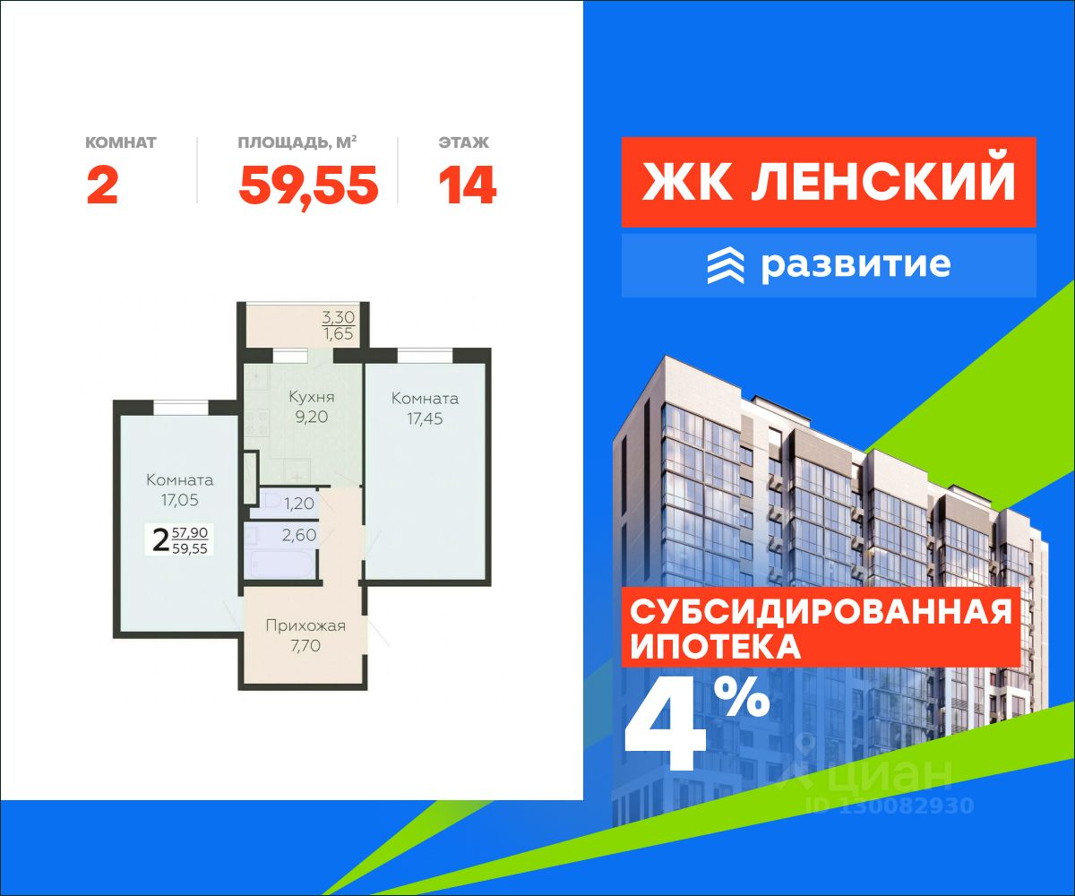 В продаже квартира площадью 59.55 кв. м с отделкой white box на 14 этаже 16 этажного дома. Квартира находится в 4834 корпусе.