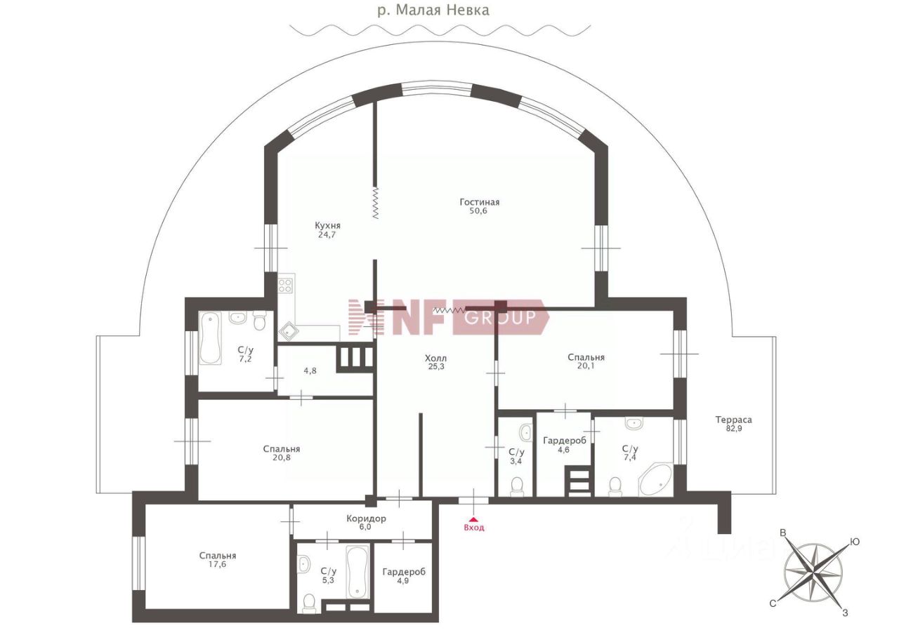 Лот: 94517. Статусная видовая квартира на Крестовском с прямым видом на воду. Планировкой предусмотрены три спальни и просторная гостиная. Прямой вид на Малую Невку. Из каждой комнаты есть выход на просторную террасу с прямым видом на воду и зелень Крестовского острова. Панорамные окна в пол в каждой комнате. Три спальни, каждая со своей гардеробной и санузлом.