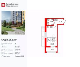 Удобная, классическая, функциональная европланировка, просторная прихожая 5.18 м². Общая площадь студии - 28.57 м², жилая 18.71 м², высота потолка 2.77 м.