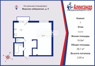Общая площадь квартиры составляет 36.1 м²., жилая площадь 16 м²., что предоставляет достаточно пространства для жизни и отдыха. Уютная кухня размером 7м²., Планировка делает квартиру визуально более просторной. Сделаны два встроенных шкафа-купе. На полу в с/у, коридор и кухня - плитка, в комнате ковролин. Просторный коридор. Балкон с видом на залив и ЗСД.