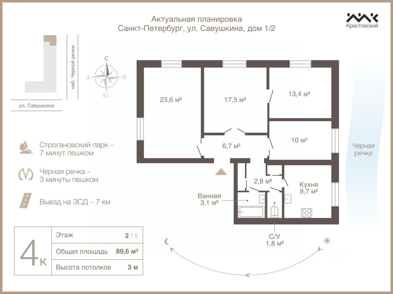 Рядом живописная набережная, ухоженный двор и быстрый выезд на ЗСД. В шаговой доступности находятся магазины, кафе, рестораны, аптеки, клиники и всё необходимое для комфортной жизни.
