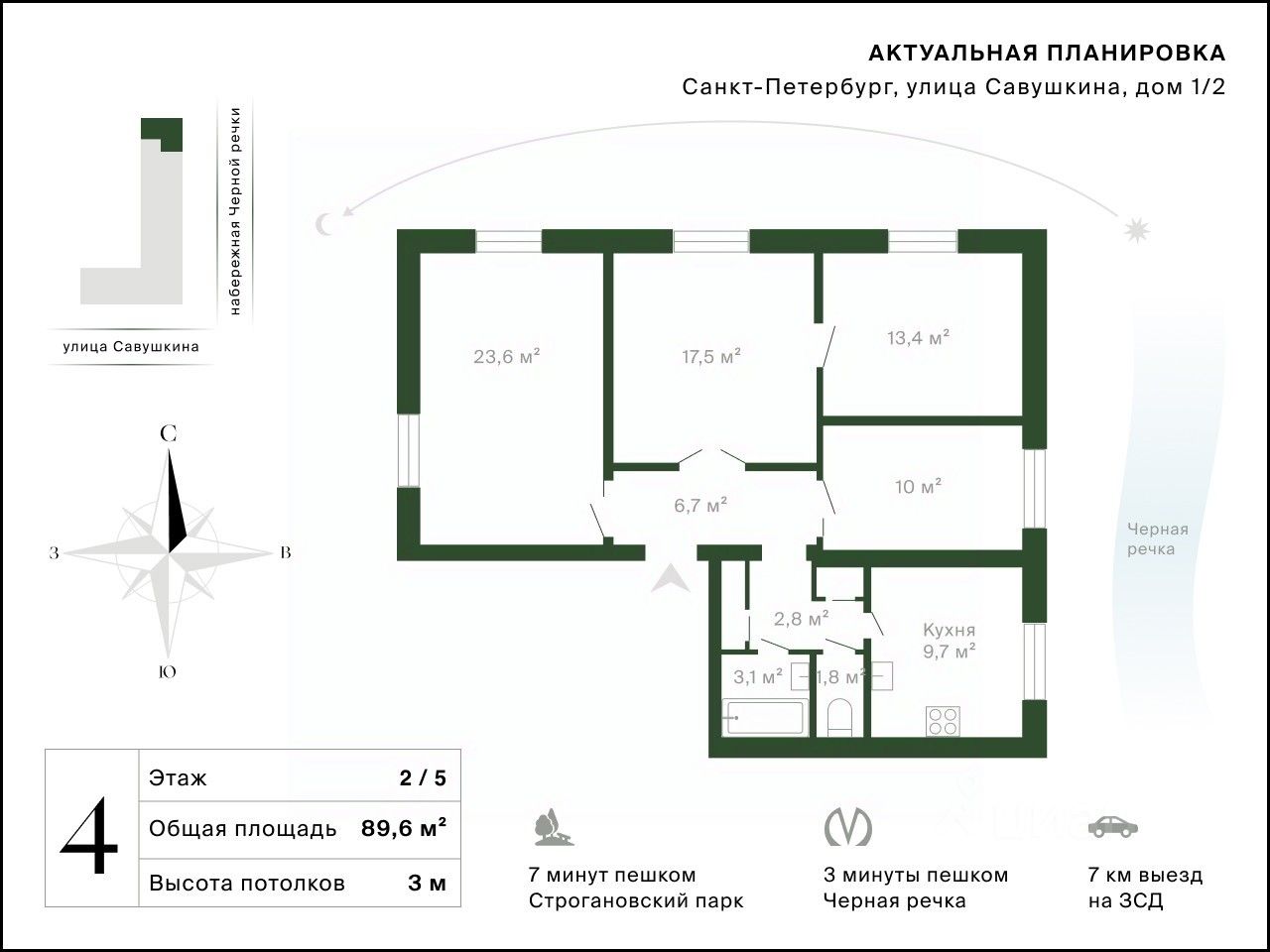 Арт. 105036724 Классический сталинский дом с кирпичным фасадом в зелёной части Приморского района — всего в трёх минутах пешком от метро "Чёрная речка". Такое сочетание — редкость: здесь легко чувствовать тишину и приватность, оставаясь при этом в шаге от ключевых транспортных артерий города.