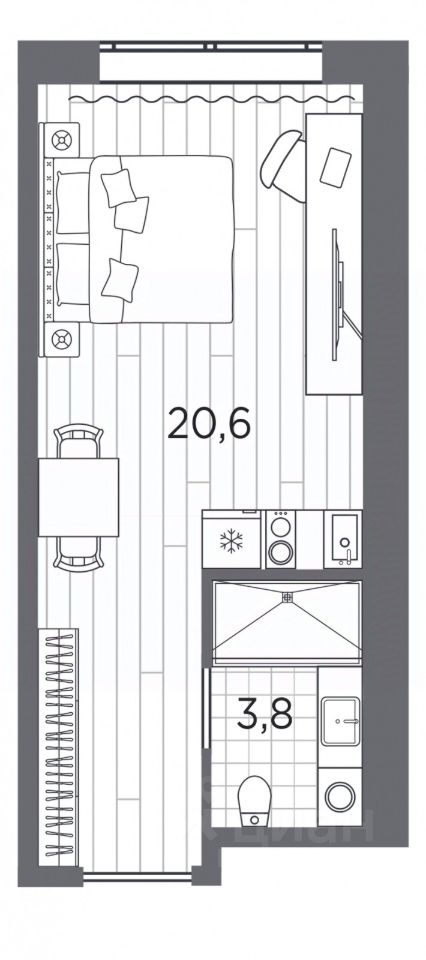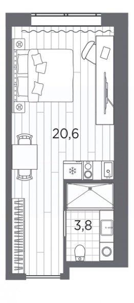 Просторные однокомнатные апартаменты-студия с отделкой в ЖК "Industrial AVENIR" на 4 этаже. Общая площадь: 24.4 кв.м., площадь гостиной 20.6 кв.м., из которых 5 кв.м. выделено под кухонную зону. Все окна выходят на одну сторону. В апартаментах один совмещенный санузел. Высота потолков 2.5 м.
