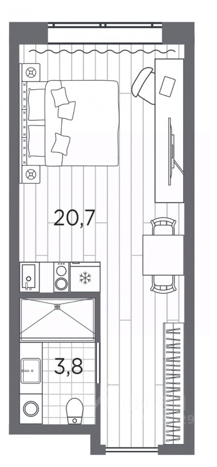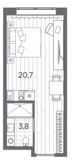 1-комн. апартаменты-студия от застройщика с отделкой в ЖК "Industrial AVENIR" на 4 этаже. Общая площадь: 24.5 кв.м., площадь гостиной 20.7 кв.м., из которых 5 кв.м. выделено под кухонную зону. Все окна выходят на одну сторону. В апартаментах один совмещенный санузел. Высота потолков 2.5 м.